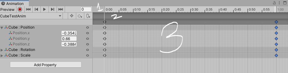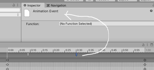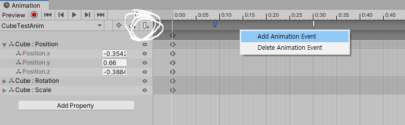 프레임 바로 아랫 줄이 애니메이션 이벤트 줄이다. 이 곳에 우클하거나 혹은 동그라미 친 곳을 통해 애니메이션 이벤트를 추가할 수 있다. 파란색으로 선택된 부분이 현재 선택된 애니메이션 이벤트다.