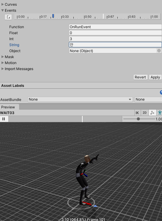 설정하고자 하는 애니메이션 에셋을 누르고 Animation 탭을 누르면 아래쪽에 Events가 있는데 여기서 애니메이션의 특정 지점에서 이벤트를 뿌릴 수 있다! 예를 들어 위와 같이 저 파란색 지점에서 OnRunEvent 라는 이벤트를 뿌리고 정수 3과 문자열 안녕을 인수로 같이 뿌리게 된다.