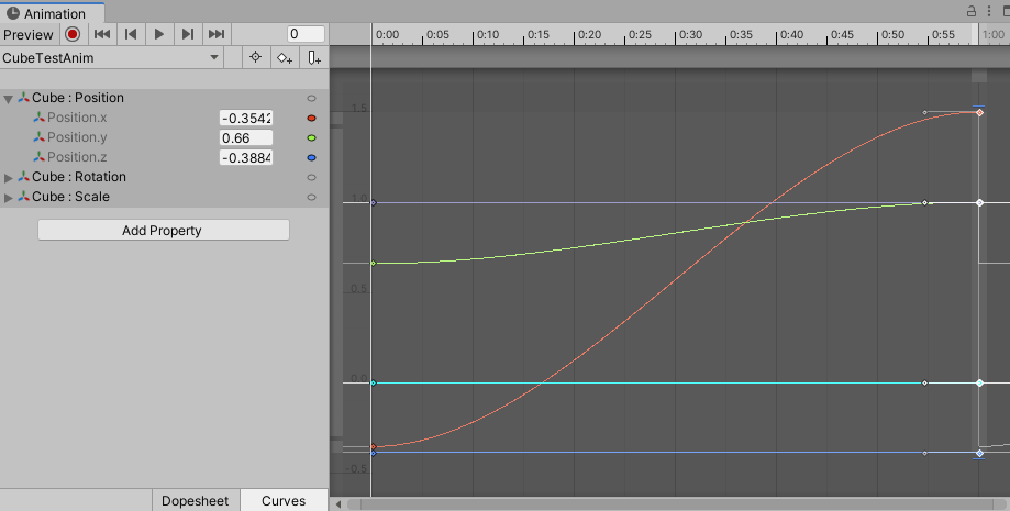 - 두 가지의 속성값만 변화시켜 입력하면, 즉 두 Key 만 입력하면 그 중간 과정은 보정되어 자연스럽게 부드럽게 이어진다. 그 보정의 중간 과정은 아랫 하단의 Curves에서 세밀하게 설정 가능