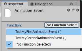 이 애니메이션이 A 라는 오브젝트에 적용되는 애니메이션이라면, A 에 컴포넌트로서 붙어있는 모든 C# 스크립트들의 함수가 이 선택한 애니메이션 이벤트의 Function 목록에 뜨게 된다.